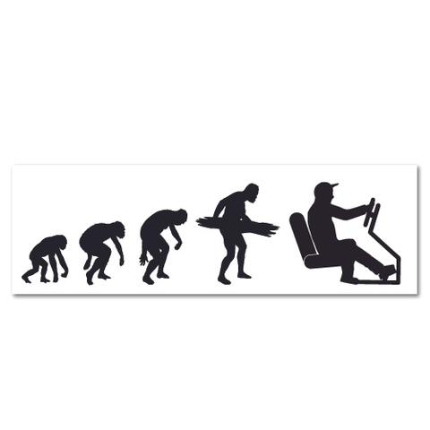 Deze sticker illustreert de evolutie van de oermens tot de autorijdende mens met een knipoog.